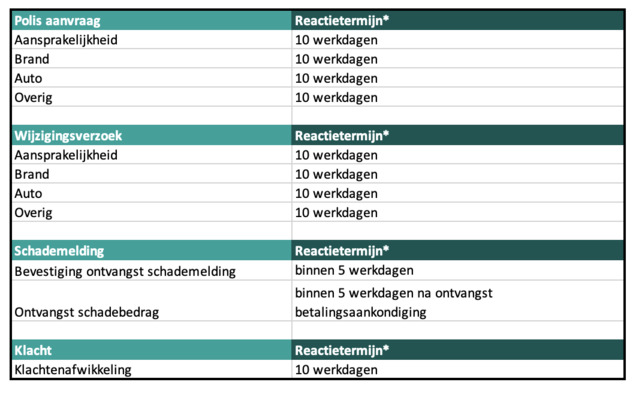 Reactietermijn per verzekeringstype